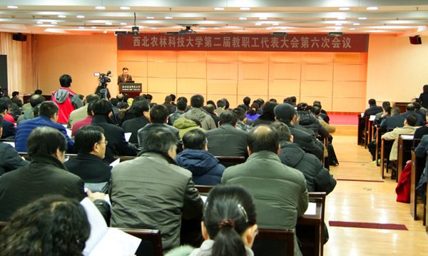 1月22日上午,西北农林科技大学第二届教职工代表大会第六次会议在国际交流中心举行。教代会正式代表230人参加会议,23位代表列席会议。会议听取和审议了孙其信校长作的2015年度学校工作报告,赵忠常务副书记作的2015年度学校财务工作报告、《关于深化校院两级管理体制改革的若干意见》《西北农林科技大学十三五发展规划(草案)》的起草说明。校党委副书记吕卫东主持会议。在校校领导参加会议。