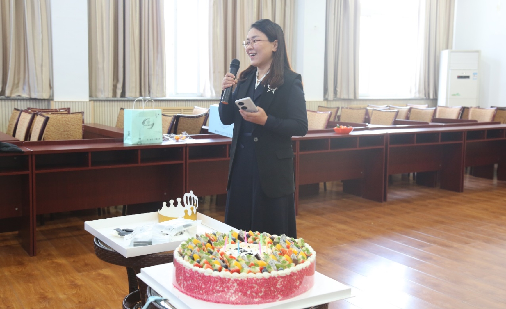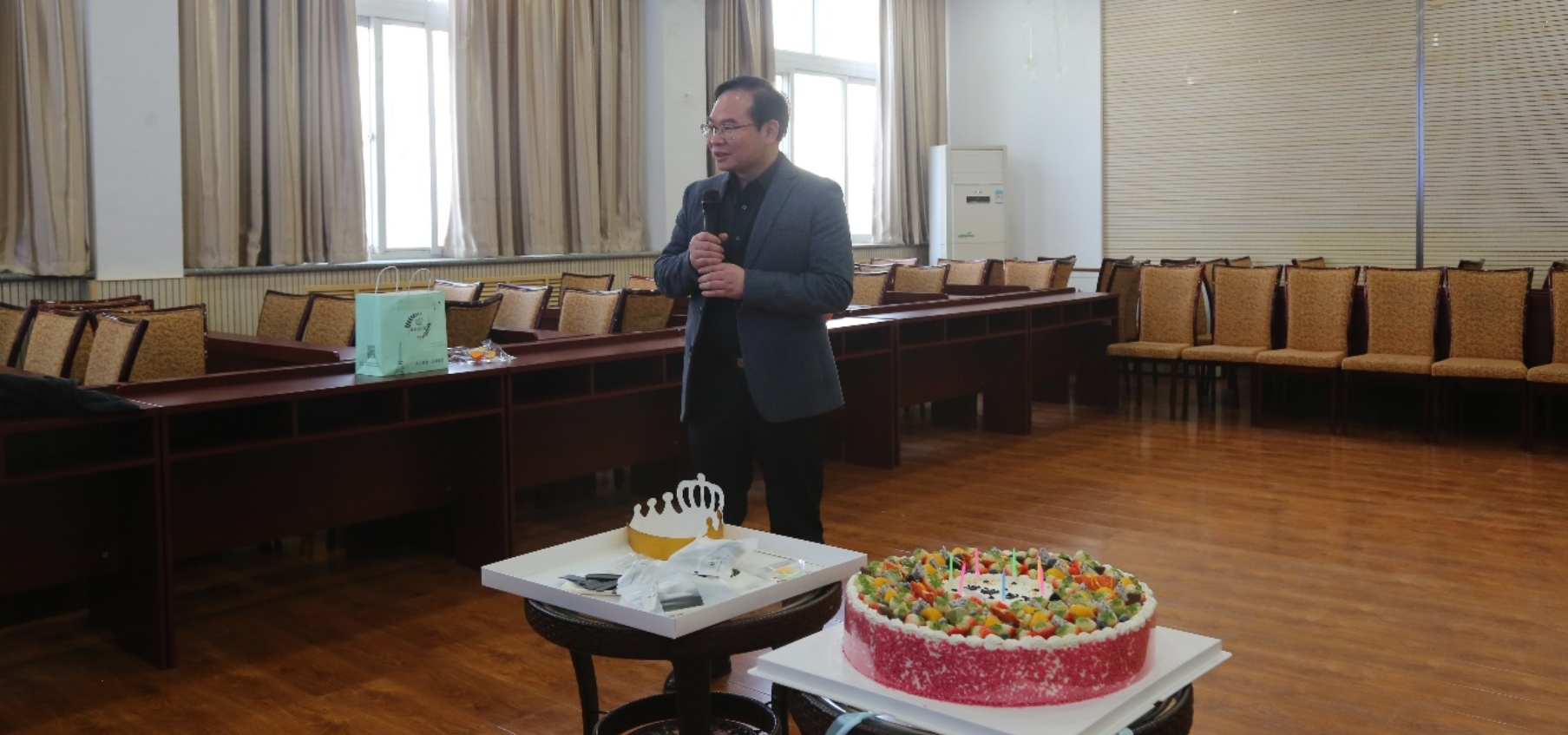 副203会议室里,在工作人员的精心装扮下,一改往日的严肃,电子屏幕上播放着温馨的生日活动背景和轻松的音乐,主席台上粘满了色彩明快的气球,会议桌上摆放了小食品和活动奖品,会议室中间小圆桌上摆放着大大的蛋糕,寿星们三三两两聊着天,满场洋溢着温馨喜乐的气息。